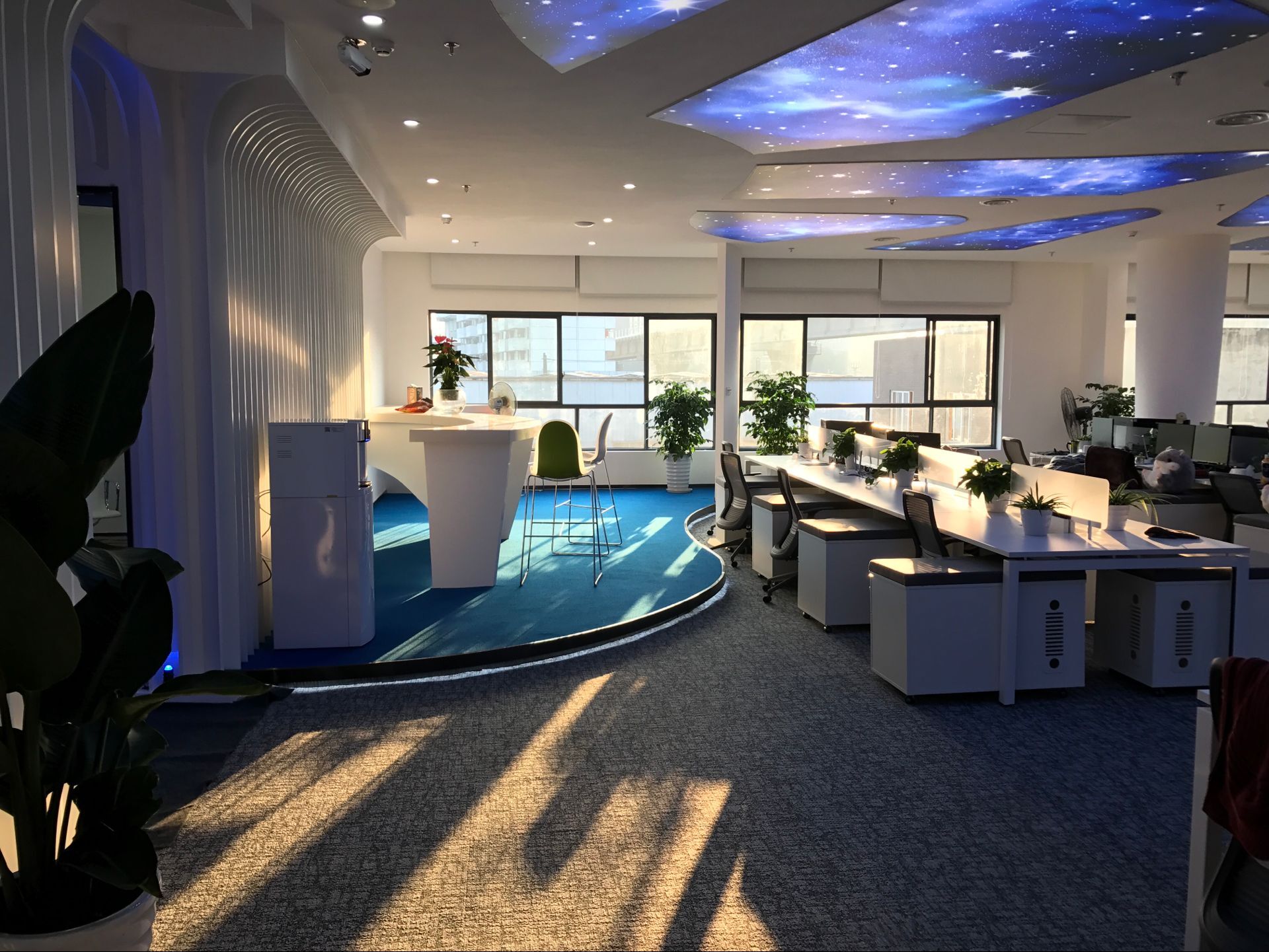 全開放式的辦公空間設(shè)計是互聯(lián)網(wǎng)式創(chuàng)意團(tuán)隊的小創(chuàng)意,這讓不同部門之間輕松對話、交流、協(xié)作,項目信息能實(shí)時互通,大大促進(jìn)了工作效率。隔板、綠植、茶幾式儲物柜...無處不在的細(xì)節(jié)設(shè)計和貼心裝飾,無一不增加了工作的情趣。