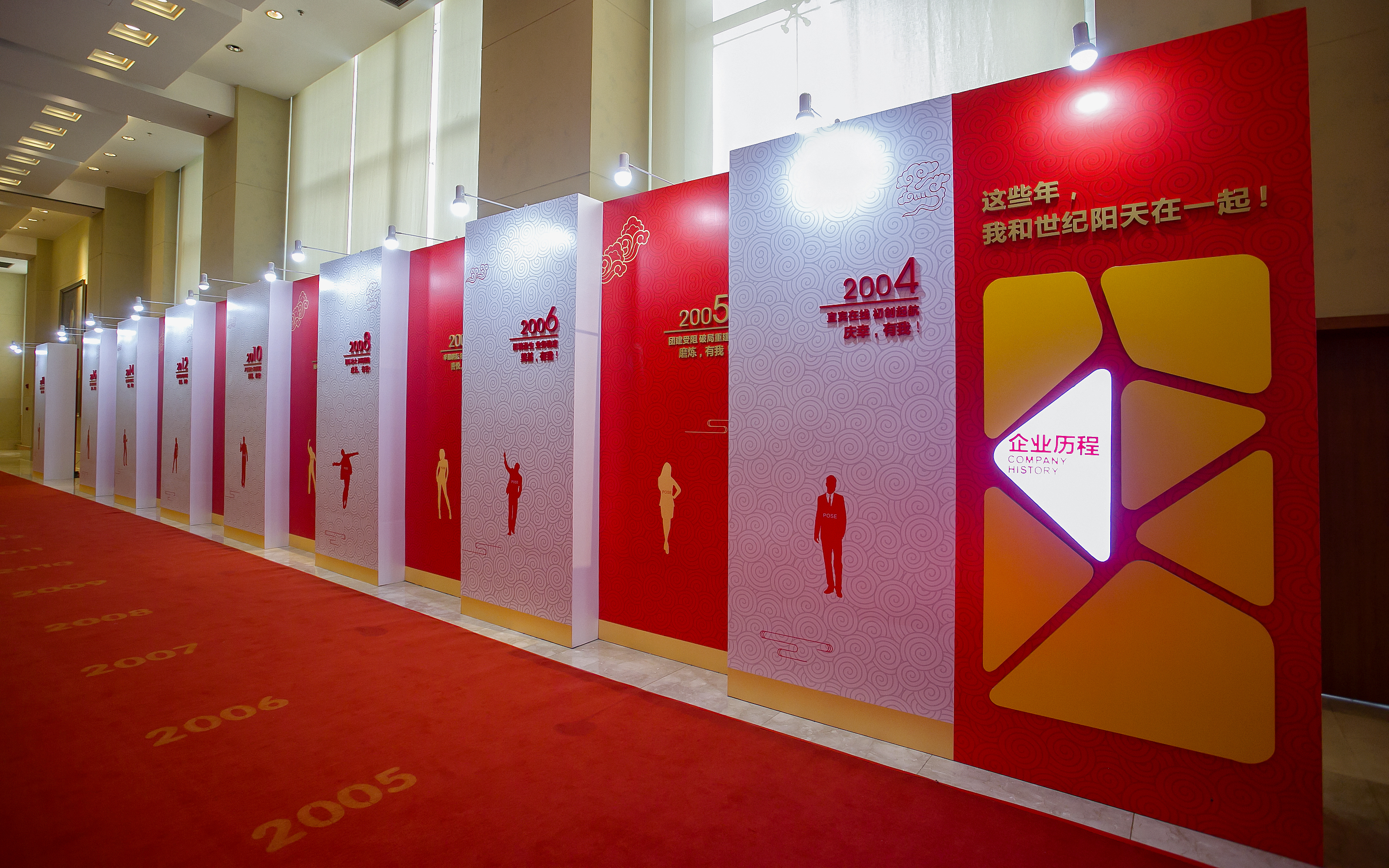 踏著紅地毯進(jìn)入宴會(huì)廳,右手邊便是以“這些年 我和世紀(jì)陽(yáng)天在一起”為中心的企業(yè)文化墻,從2004年宜賓在線初創(chuàng)起航;到2009年世紀(jì)陽(yáng)天誕生,扎根成都;再到2014年全國(guó)跨步,立足成都;2018年輝煌續(xù)寫,進(jìn)無(wú)止境……近14年的企業(yè)歷程,展現(xiàn)了世紀(jì)陽(yáng)天腳踏實(shí)地、茁壯發(fā)展、昂首前進(jìn)地信心與決心。